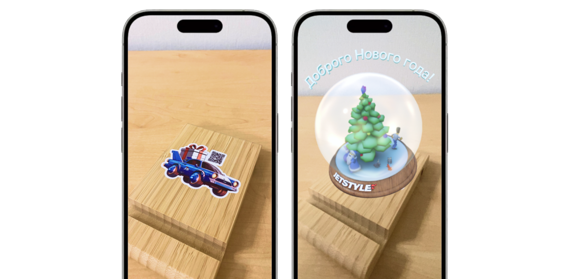 AR на необычном носителе для клиентов JetStyle. В этом году в качестве одного из корпоративных подарков от нас мы сделали деревянную подставку под телефон с наклейкой в виде летающей киберпанк-машины, которая доставляет диджитал-подарки. QR-код с наклейки оживляет праздничный сюжет — и в течение года мы планируем его обновлять: для разных праздников или к смене сезонов.