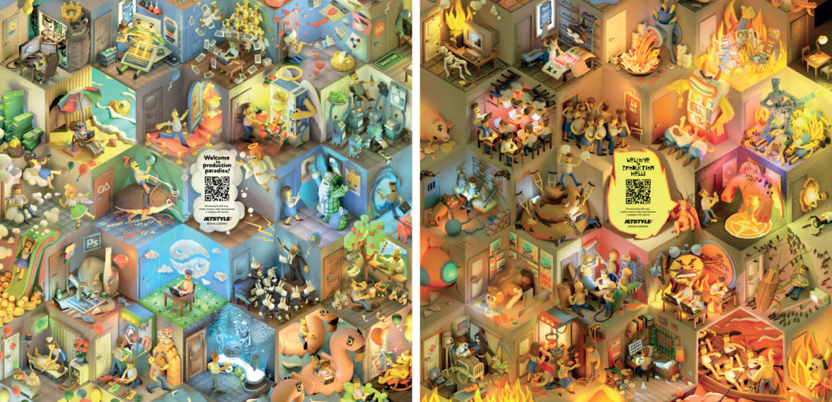 AR-плакаты «Ад и Рай разработчика». Мы любим AR-плакаты, потому что это простой способ показать возможности дополненной реальности и приятный подарок. В новой серии на каждом плакате мы изобразили множество комнат с микросюжетами. На плакате «Рай» можно рассмотреть, в каких условиях мечтают работать наши разработчики: родео на жуке-носороге, кодинг на шезлонге у моря, хор ангелов стоит над душой и целая комната денег. А на плакате «Ад» можно увидеть их страшный сон: процессор в огне, белая мягкая комната виарщика, трехглавый пёс, который съел все наработке — в общем, есть чему ужаснуться.