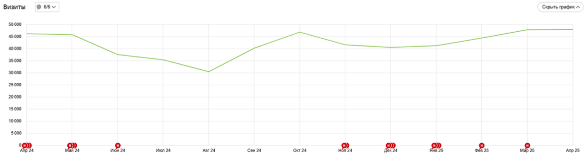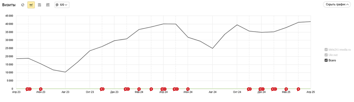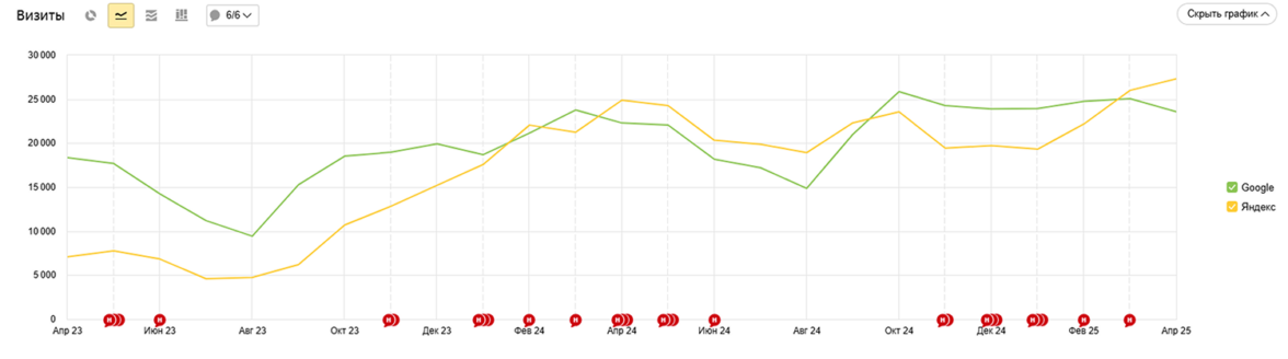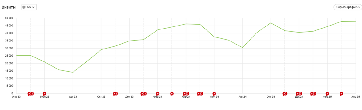 Рост органического трафика на сайте за 2 года с апреля 2023 по апрель 2025
