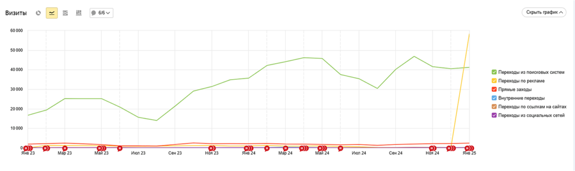 С i-Media клиент работает уже более 10 лет. В 2023–2025 годах мы сфокусировались на обновлении сайта. Задачи ставились в соответствии с актуальными требованиями к контенту, юзабилити и техническому состоянию. Такой подход позволил достичь кратного роста органического трафика.