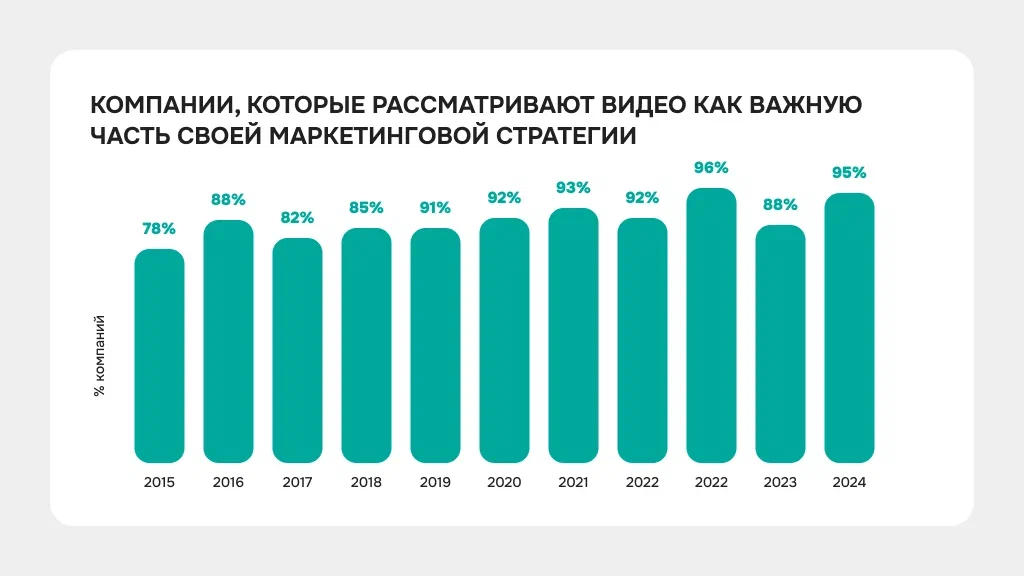 Согласно исследованию, проведенному Wyzowl, 95% компаний считают, что видеоконтент будет необходим для продвижения компании в 2025 году: