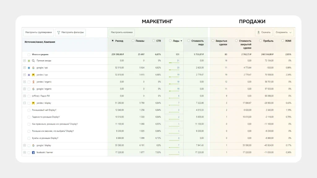 Сквозная аналитика позволит «примирить» отделы маркетинга и продаж и оптимизировать расходы. Потому что с ее помощью вы сможете отследить, каким образом клиент попал в вашу воронку продаж.