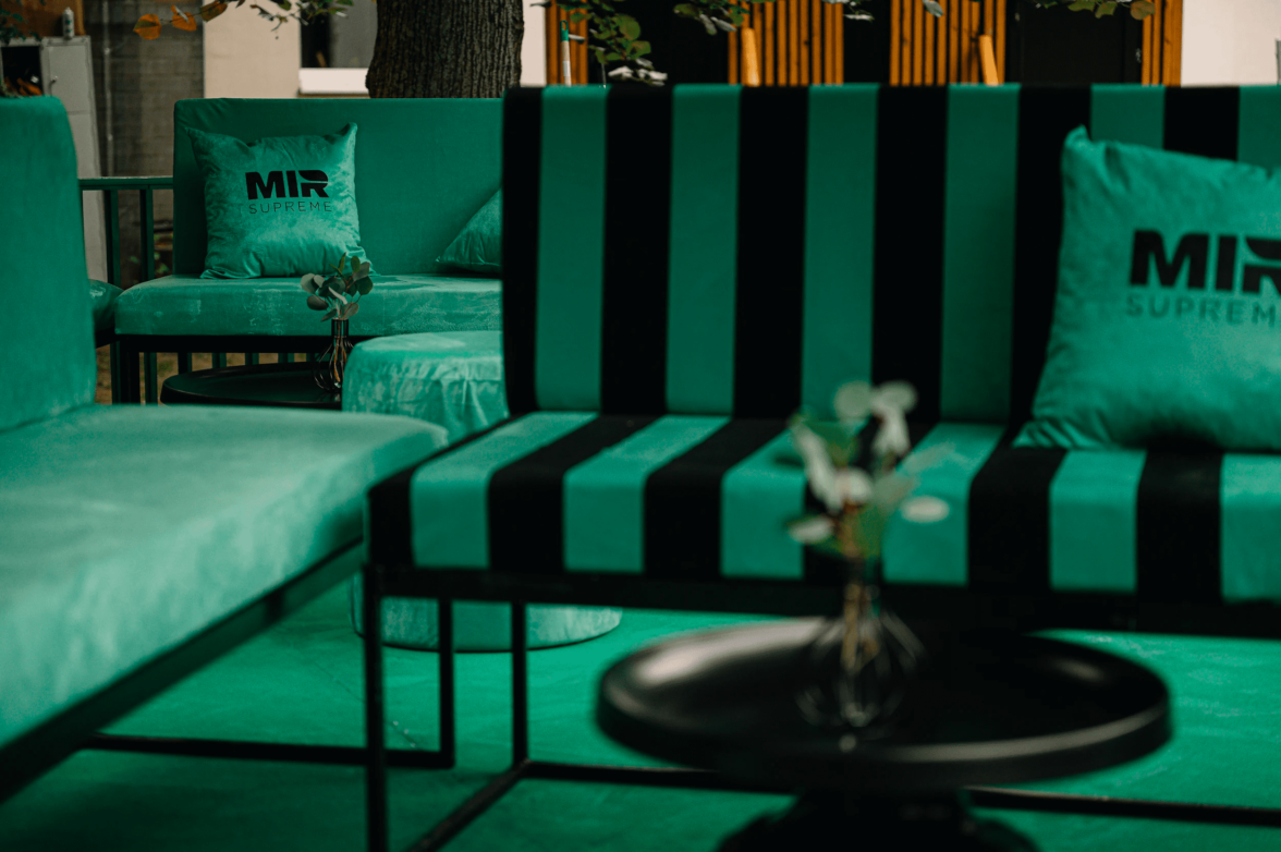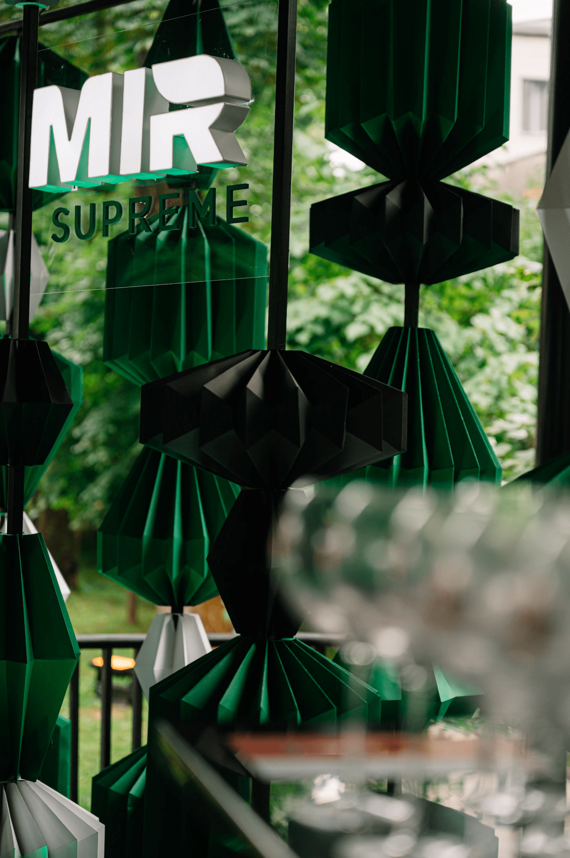 Интеграция состояла из 3-х брендированных зон: Chess Cup, Chess Village и VIP-lounge. Во время разработки концепта застройки креативная команда предложила сделать визуальный акцент на двух основных цвета бренда — черном и зеленом. При помощи зонирования по цветам и перехода между ними в виде узнаваемого элемента Mir Supreme — лепестка, получилось сделать стильное монохромное пространство. Еще один акцент — на арт-фотозоне из разноуровневых стел.