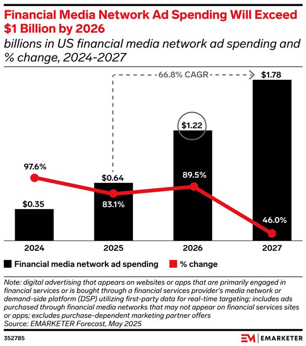 Исследовательская компания eMarketer называет финансовые медиасети (Financial media networks, FMN) — новыми возмутителями спокойствия на рекламном рынке. В 2024 году аналитики оценивали рынок американских финтех-медиа в $350 млн, в этом году он достигнет $640 млн, в следующем составит $1,22 млрд, а в 2027-м — $1,78 млрд. И хотя темпы роста рынка уже снижаются, пока они в десятки раз выше других сегментов рекламного рынка. Если в прошлом году выручка финансовых медиасетей выросла на 98% к 2023 году, то в 2027-м, по прогнозам, увеличится на 46% в годовом выражении. На протяжении трех лет средний годовой рост этого медиаканала составит 67%.