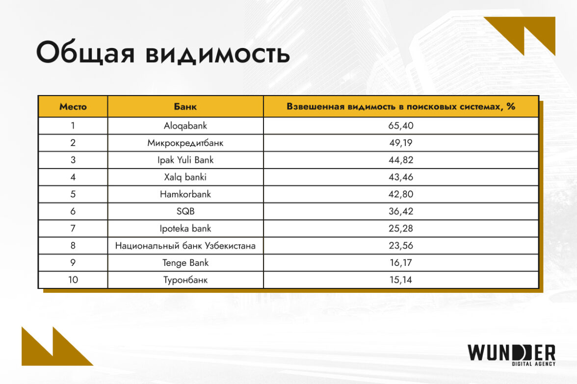Первое место в этом поисковике занял Aloqabank (66,39%). На второй позиции — «Микрокредитбанк» с показателем 53,61%. Xalq banki (48,11%) стал третьим, сделав упор на SEO-продвижение в Google.