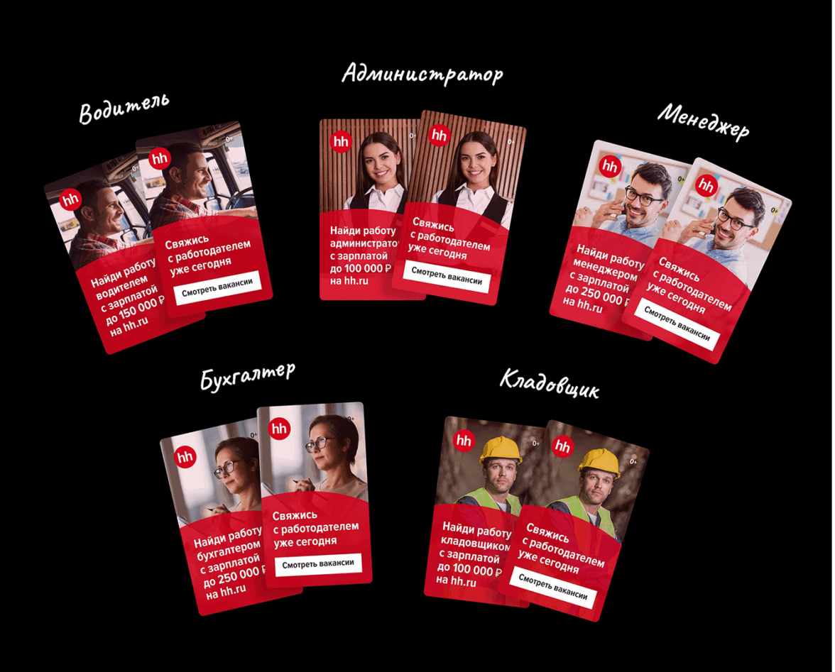 Разработали пять паков HTML5-баннеров для рекламы в Яндексе и Гугле под выдачу популярных запросов по поиску работы администратором, водителем, кладовщиком, бухгалтером и менеджером по продажам.