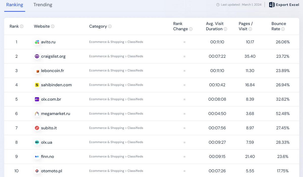По данным SimilarWeb, российский классифайд занимает первое место в рейтинге посещаемости досок объявлений в мире. В России в феврале этого года «Авито» занял 14 строку среди крупнейших интернет-ресурсов и первое место среди классифайдов. По собственным данным компании, в апреле 2023 года число активных объявлений на «Авито» превысило 150 млн штук — больше, чем население России.