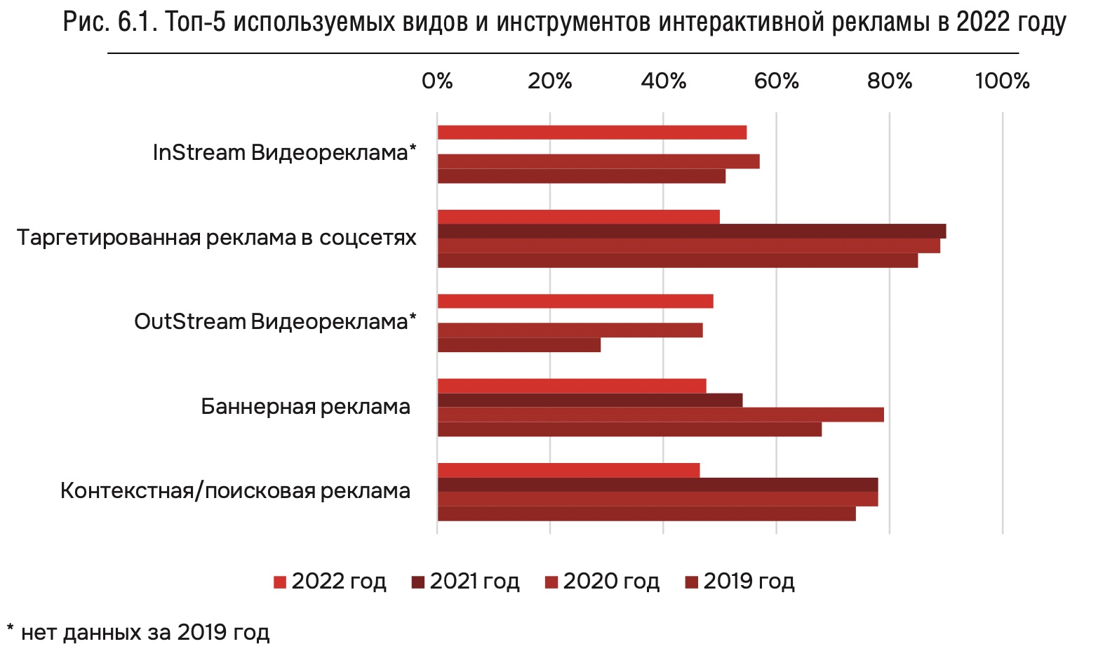Расходы на рекламу составляют ровно половину в общей структуре маркетинговых бюджетов. Несмотря на то, что ей удалось восстановиться после падения в 2021 году, она не смогла вернуться к показателям 2020 года. Вложения в интернет-рекламу сократились на несколько пунктов и составили 43%.