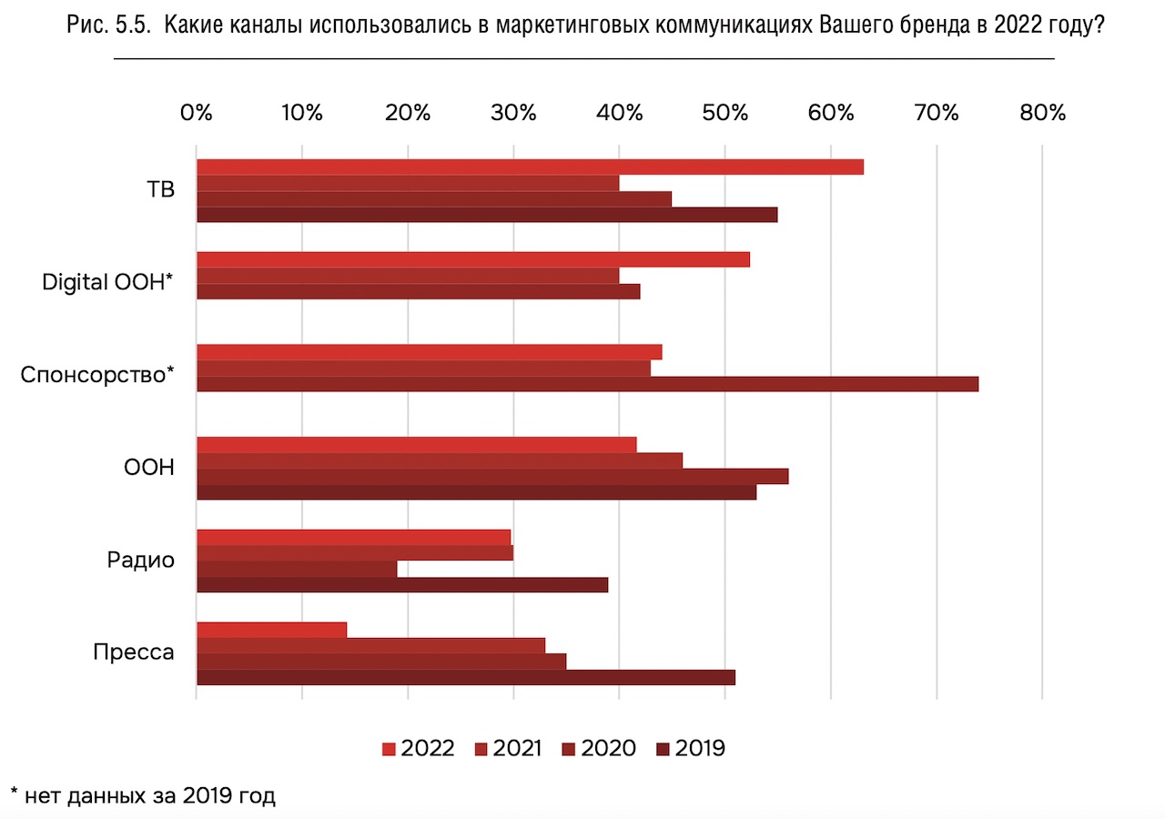 Резко увеличился интерес к телевидению и DOOH. Доля опрошенных, размещающих рекламу на радио и занимающихся спонсорством мероприятий, осталась неизменной. Также продолжилось падение доли прессы.