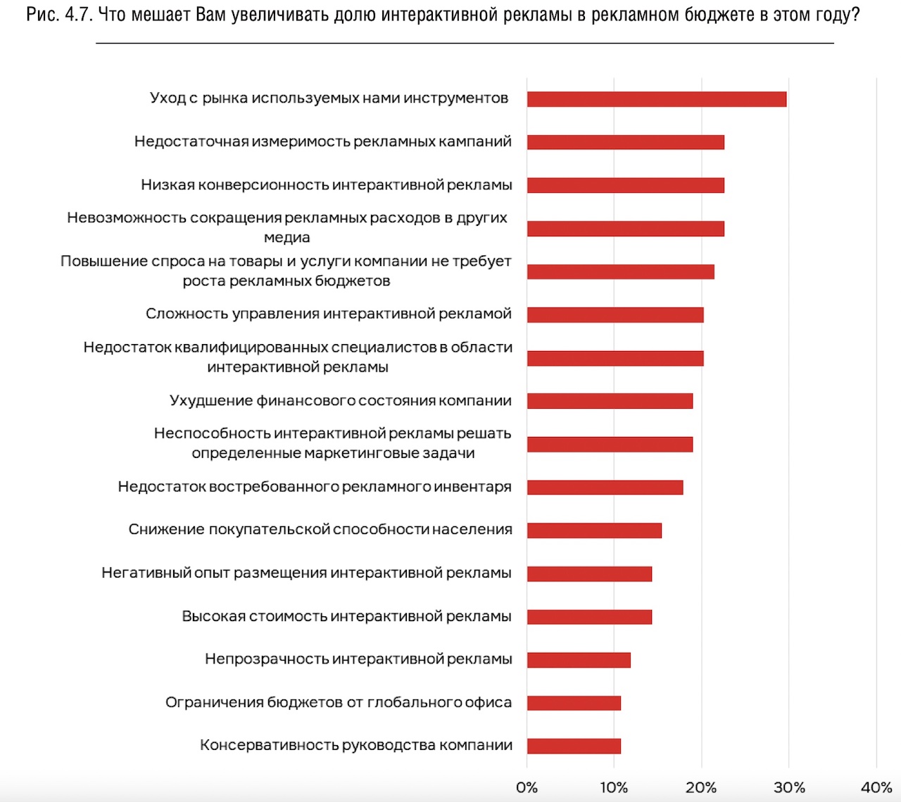 Барьерами для развития цифровой рекламы участники исследования назвали уход зарубежных инструментов (30%), недостаточную измеримость кампаний (23%) и низкую конверсионность (23%).