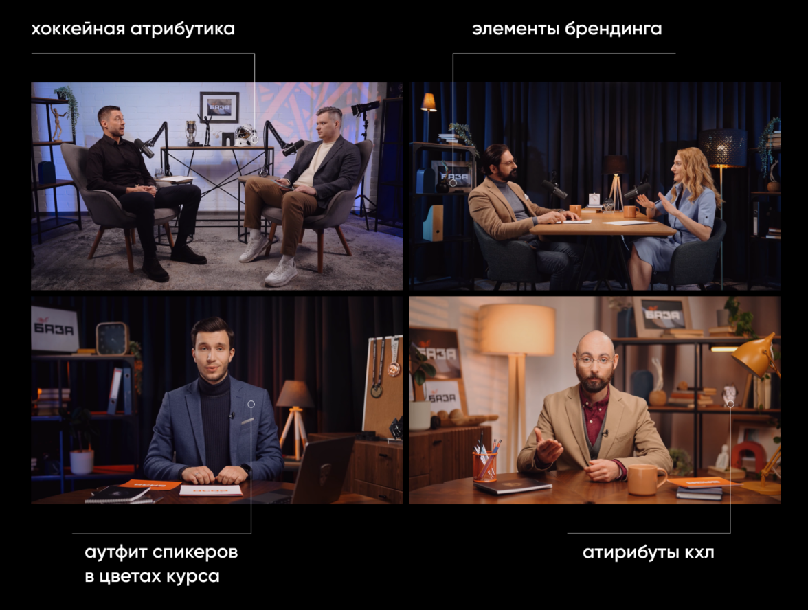В итоге остановились на «живых» кастомных декорациях. Для каждого курса художник-декоратор разработал уникальный дизайн, но сохранил единую систему. Мы сознательно отошли от холодных пустых студий в сторону домашней, доверительной атмосферы, чтобы поддержать дружелюбие фирменного стиля. Спикеры общаются в уютных студиях на фоне книг и спортивных отсылок. На полках можно увидеть логотип КХЛ, брендинг проекта или хоккейные атрибуты. В съёмках участвовали десятки человек. Чтобы скоординировать работу и подготовить спикеров, провели репитиции и брифинги, подготовили фирменные памятки с расписанием и подборки комплектов одежды, по которым можно выбирать аутфиты.
