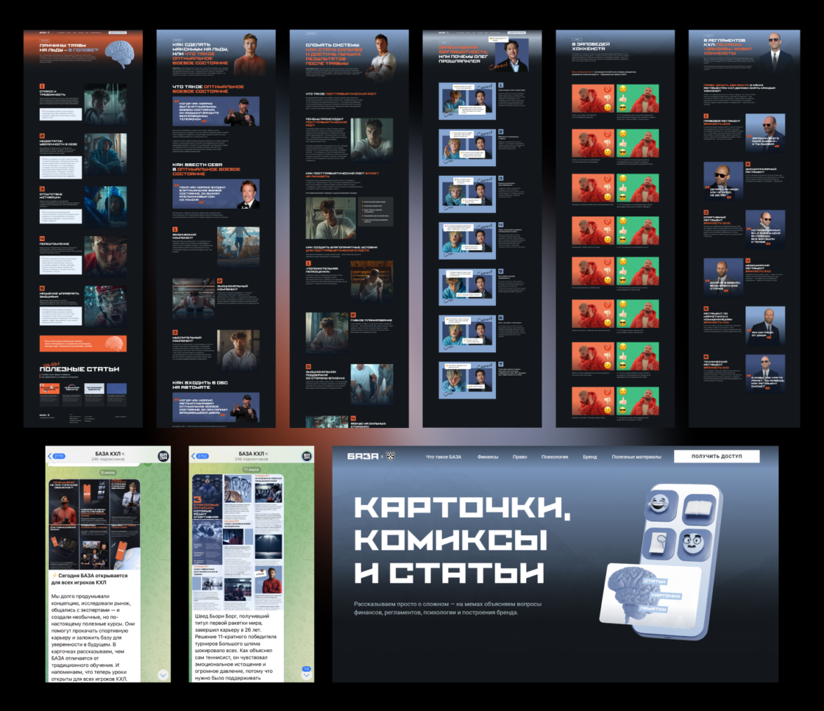 Для обратной связи с аудиторией создали закрытый Telegram-канал. В нём размещаем анонсы проекта и делимся полезными материалами, которые дублируются в базу знаний на портале. Задача статей — прогревать интерес к темам обучения. Мы учли особенность образа жизни хоккеистов и выбрали короткие лёгкие форматы, которые при этом не теряют свою полезность. Например, регламенты КХЛ объясняем на мемах со Стэтхемом. В комиксе с демоном рассказываем, как не надо поступать, когда заключаешь рекламный контракт.