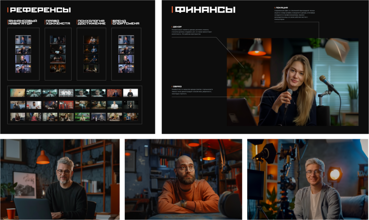 Чтобы визуал соответствовал высокому качеству контента, который потребляет аудитория, мы тщательно подошли к дизайну кадра. Отсмотрели сотни часов подкастов и интервью разных жанров, собирали референсы и генерировали концепт-арты с помощью нейросетей по нашим дотошным промптам. Сравнивали студии видеопродакшена по десяткам критериев — оборудование, реквизит, команда, постпродакшен и даже уют в гримёрке. Рассматривали варианты с виртуальными фонами и готовыми студиями для съёмок, делали тестовые макеты с посадкой спикеров.