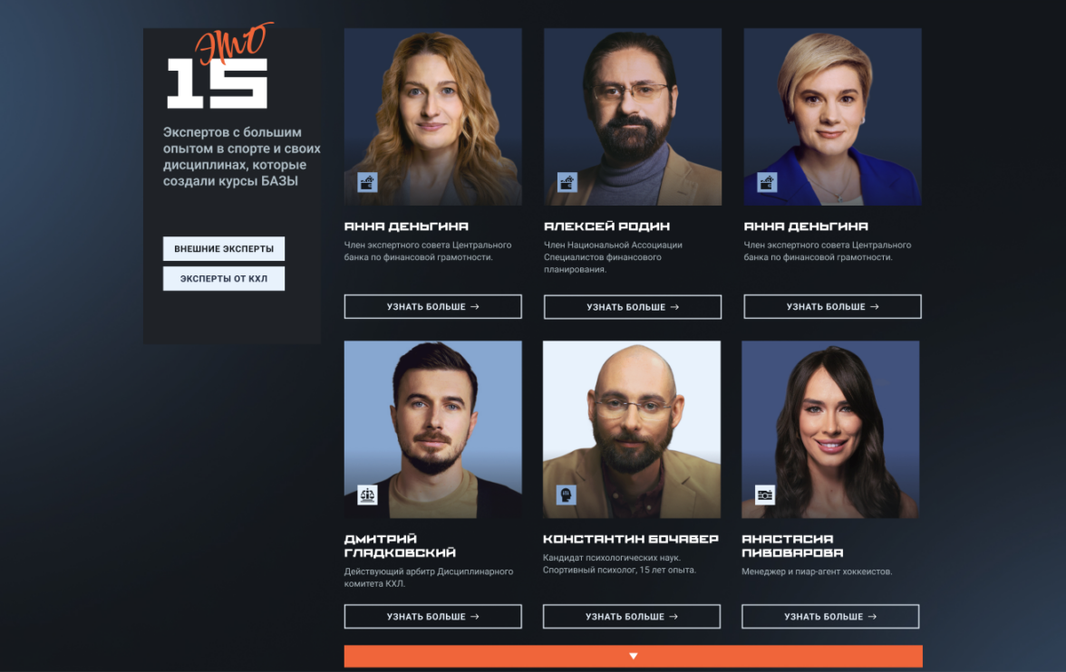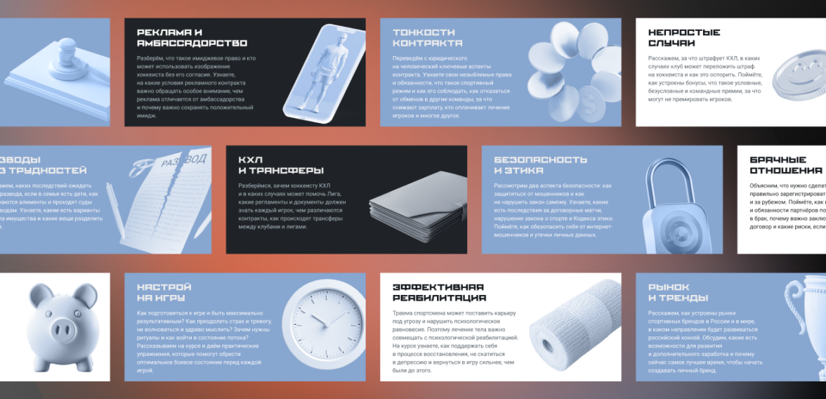 Определили, что обучение будет разбито на 4 сферы: финансы, психология, право и личный бренд. Изначально планировался фокус только на работе с ситуациями вне хоккейного льда. После интервью с представителями КХЛ поняли, что есть знания, которые решат проблемы не только в личной, но и в профессиональной сфере. Так мы дополнили структуру курсов экспертными материалами от Лиги.