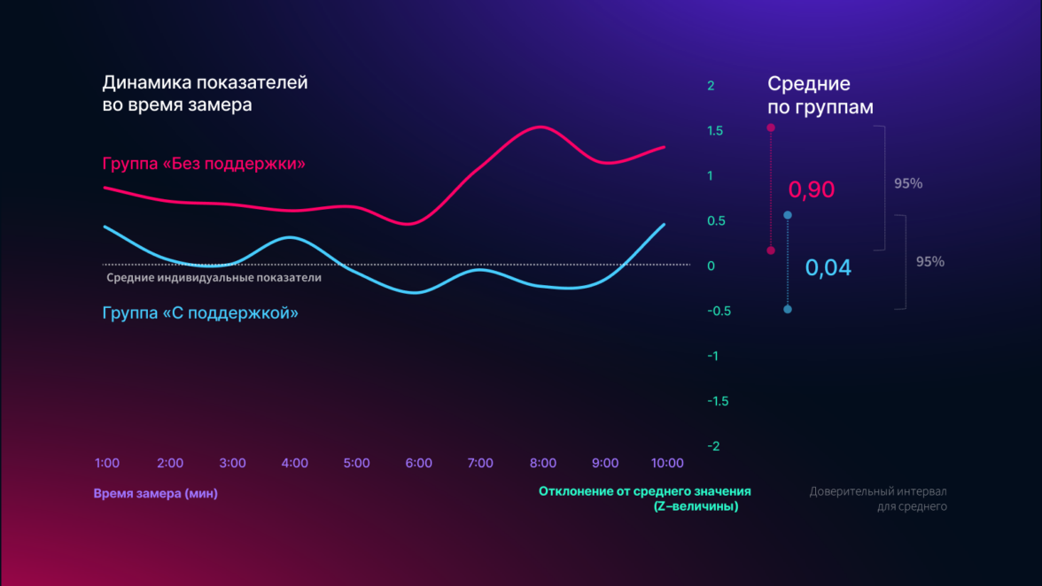 В основу эксперимента легла гипотеза о том, что бегуны, которых поддерживают близкие, добиваются лучших результатов. Эксперты СберЗдоровья и СберМаркетинга проверили ее с помощью новых технологий в нейрофизиологии. Это не медицинский эксперимент, однако его результаты — наглядный пример влияния психоэмоционального состояния на спортивные достижения.