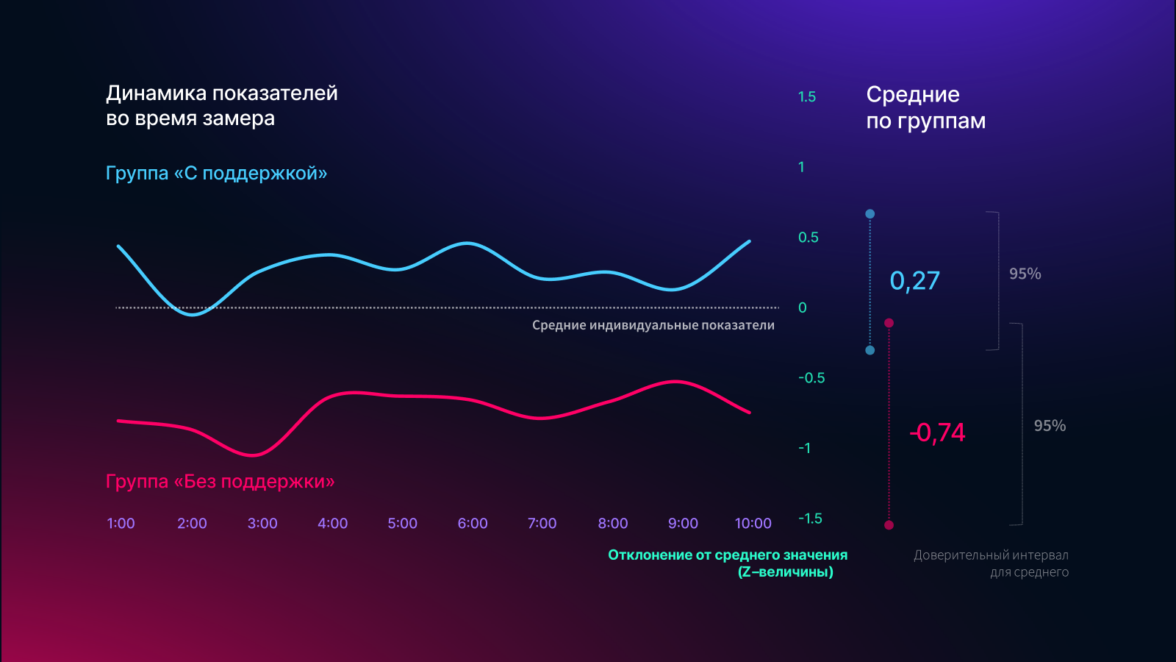 Эксперты СберМаркетинга и СберЗдоровья выяснили, что перед забегом спортсмены, которых поддерживали, показали меньший уровень стресса (–0,40) по сравнению с контрольной группой без поддержки близких (–0,54), а во время забега еще более значимые различия: +1,01 vs –0,22 соответственно.