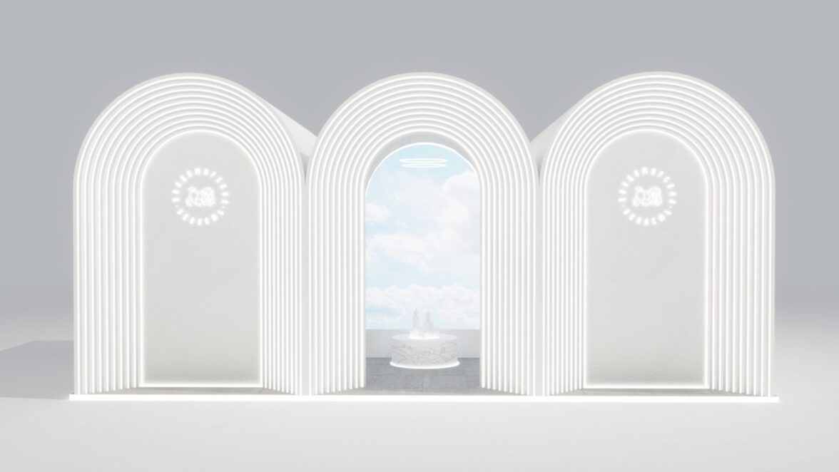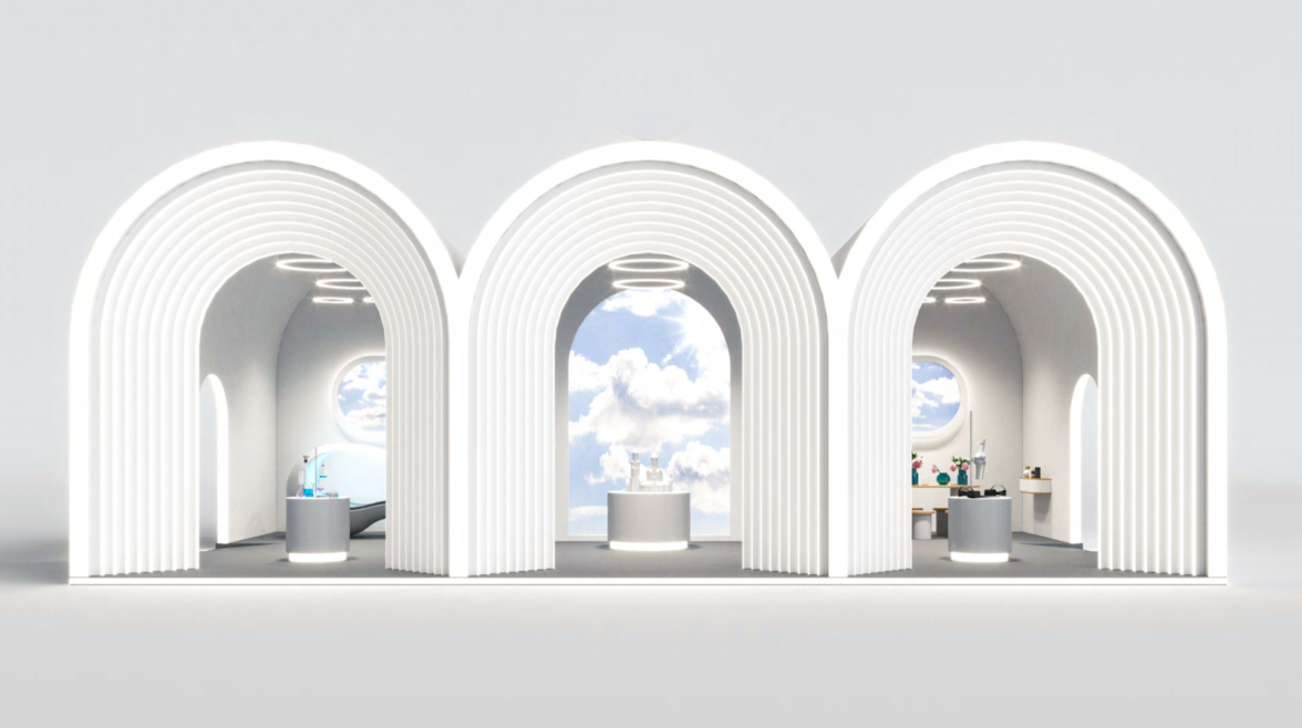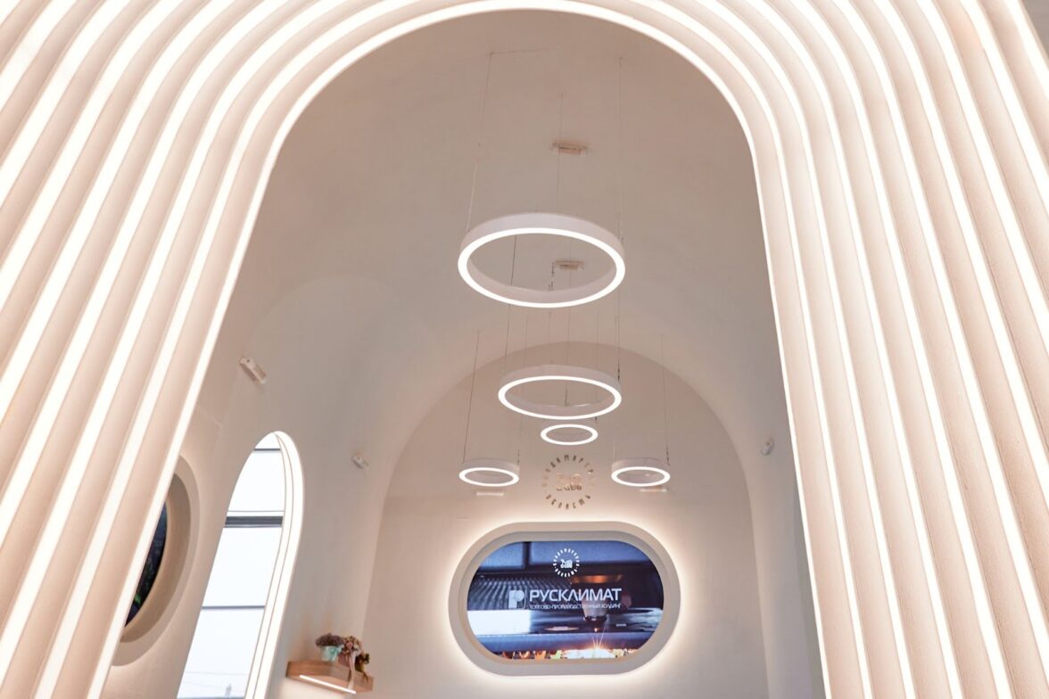 Однако по техническим требованиям выставки, застройка не могла быть полностью закрытой, и первые чертежи не проходили согласование. Командам агентства и клиента хотелось сохранить лаконичные арки в архитектуре стенда, и на второй итерации попробовали сделать их более открытыми.