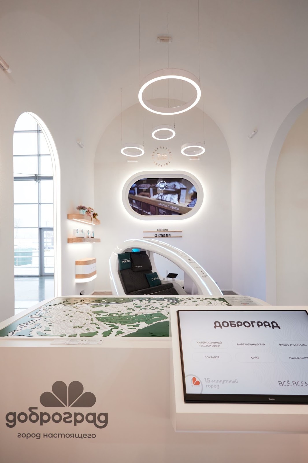 3. Виртуальный тур по Доброграду — новому городу Владимирской области, где соединились современные технологии, живописная природа и мультифункциональная среда, способная адаптироваться под потребности человека. На touch-панели организаторы предлагали гостям узнать больше о городе, совершить виртуальный тур или отправиться на видеоэкскурсию.