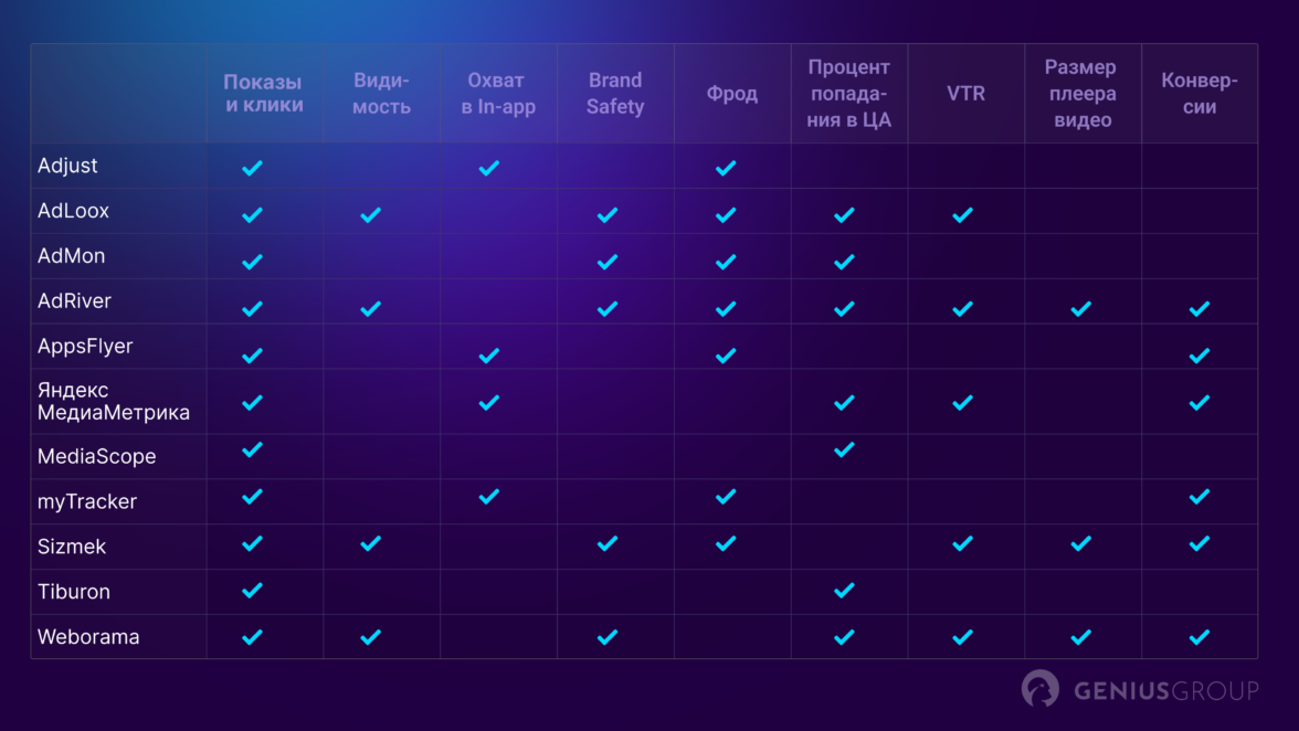 Независимые внешние платные сервисы (Weborama, Adriver, Adloox и другие).