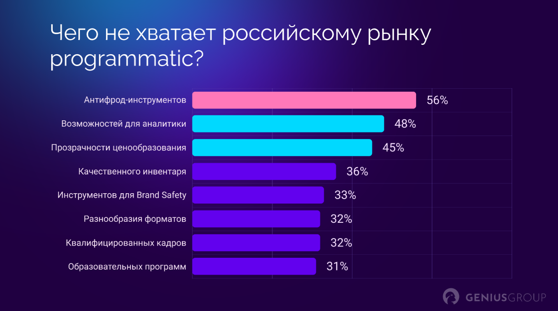 В опросе в рамках Programmatic Report отмечается, что российскому рынку программатик не хватает, в первую очередь, антифрод-инструментов. В ходе глубинных интервью эксперты также выделили отсутствие единого подхода к терминологии работы с фродом и финансовым компенсациям за невалидный трафик.