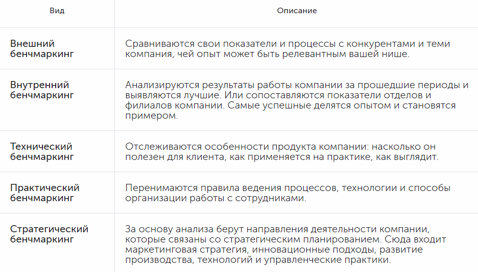 Бенчмаркинг — это анализ лучших бизнесов в аналогичной нише и других для применения успешных практик и исправления ошибок в работе своей компании. Изучается открытая информация о деятельности конкурентов: процессах, подходах, продукции, производстве и клиентах.