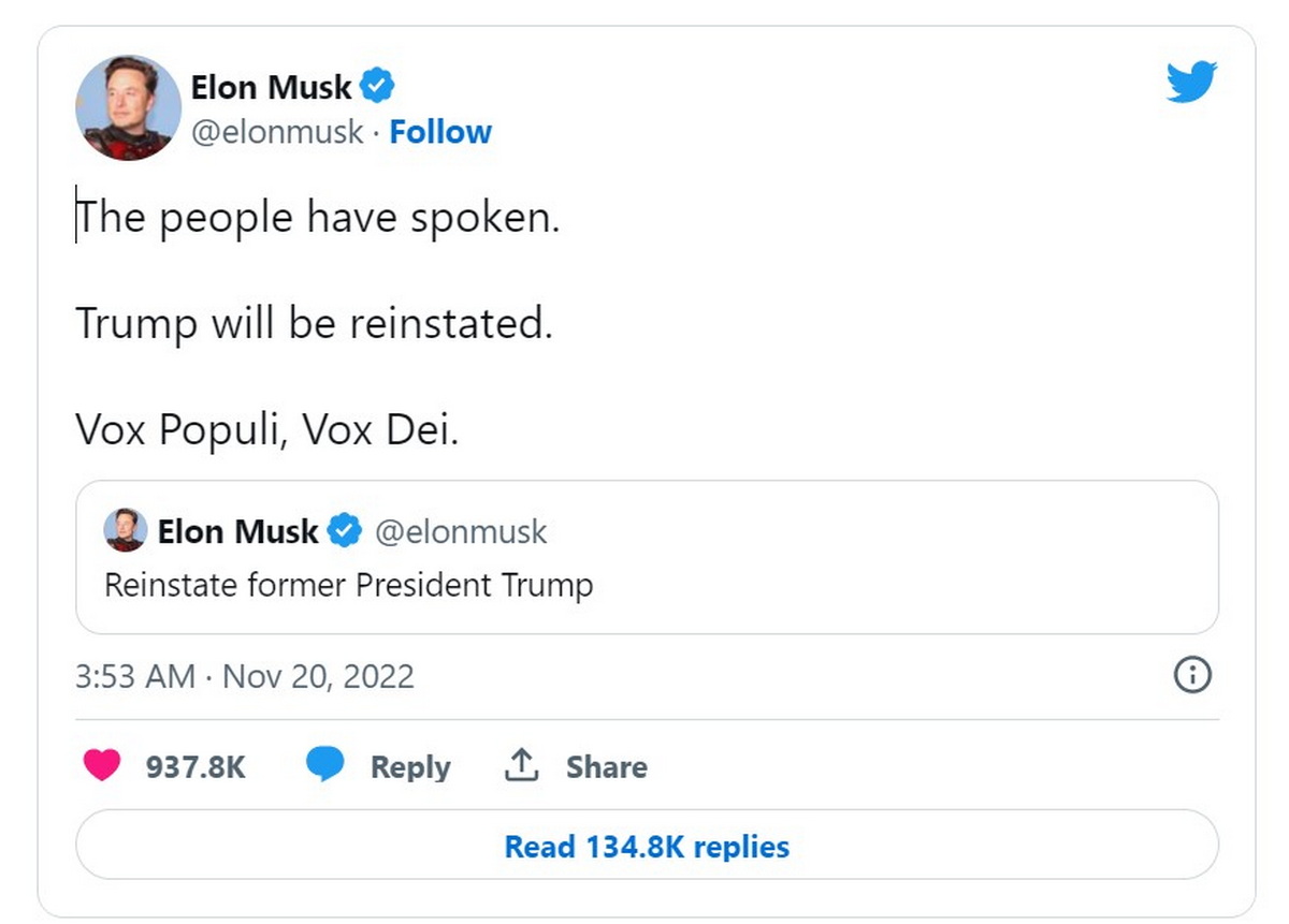 Маск, который ещё до покупки соцсети обещал освободить политика, сделал это 20 ноября после проведённого опроса.