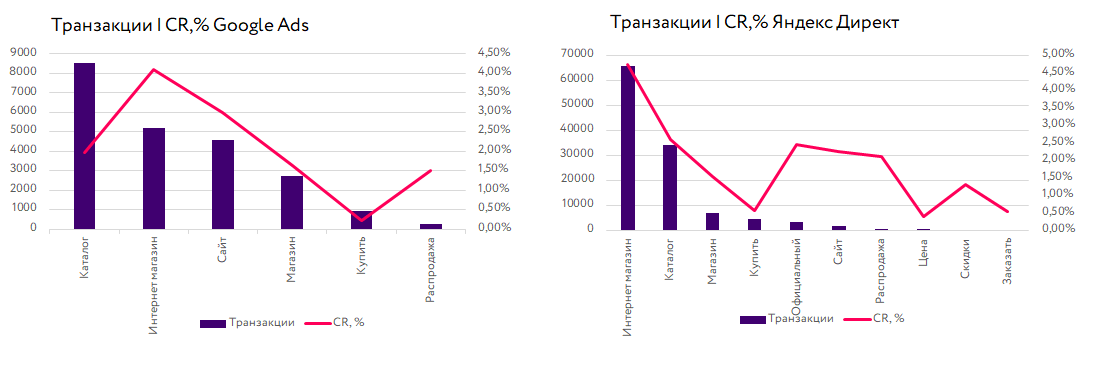 Исследуя эффективность моноприставок, мы обнаружили интересный факт — запросы с одинаковыми добавками приносят разные результаты в Google и Яндексе. Например, абсолютным лидером по количеству транзакций в Google Ads является «каталог», тогда как в Яндекс.Директе — «интернет-магазин». При этом коэффициент конверсий в обоих случаях выше у добавки «интернет-магазин».