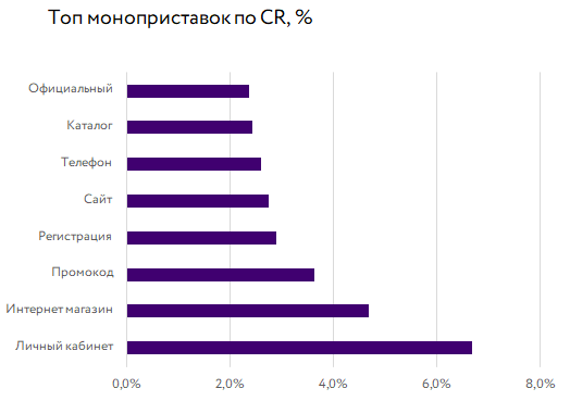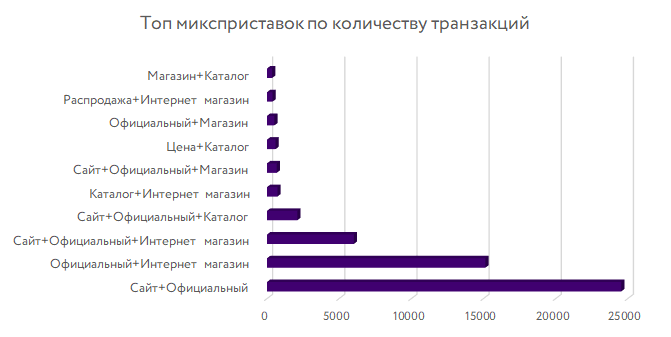 По количеству транзакций и коэффициенту конверсий микс-приставки «сайт + официальный», «официальный + интернет-магазин», «сайт + официальный + интернет-магазин» заметно преобладают над самой популярной моноприставкой «купить».
