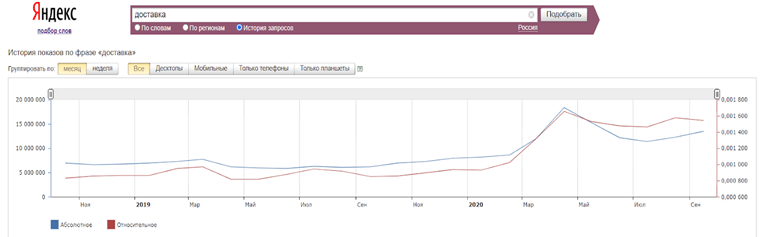 В 2020 году в связи с пандемией выросло количество запросов, связанных с доставкой (бесплатная, безопасная и тому подобное). В связи с этим ключи с добавкой «доставка» стали приносить большее количество кликов и транзакций, улучшив показатели CR. Причём этот показатель намного выше у брендовых запросов с такой приставкой.
