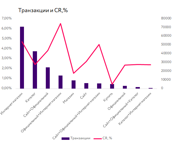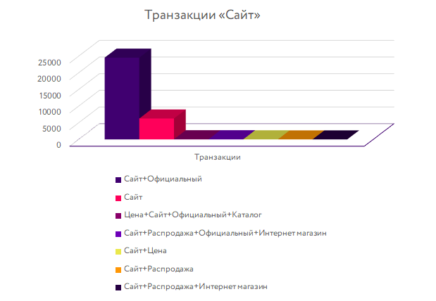 При этом «сайт» в сочетании с «распродажа» или «цена» практически не приносит транзакций. Если для пользователя на этапе покупки преобладающим фактором является стоимость товара, а конкретный интернет-магазин не является дискаунтером или лидером по низким ценам среди конкурентов, то транзакции не происходит.
