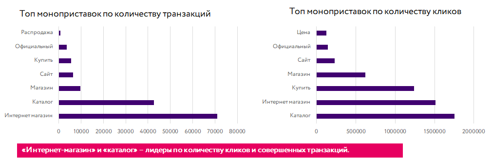 Наше исследование показало, что больше всего транзакций и кликов приносят запросы с добавками «интернет-магазин» и «каталог». На самом верхнем этапе воронки продаж пользователь изучает предложения различных магазинов и выбирает наиболее выгодные, чтобы принять окончательное решение. Что интересно, «интернет-магазин» преобладает над просто «магазин» — покупатели пока не готовы массово возвращаться в офлайн.
