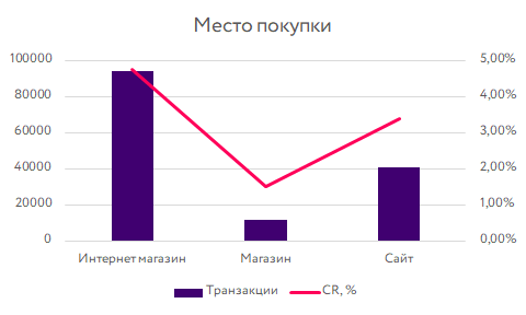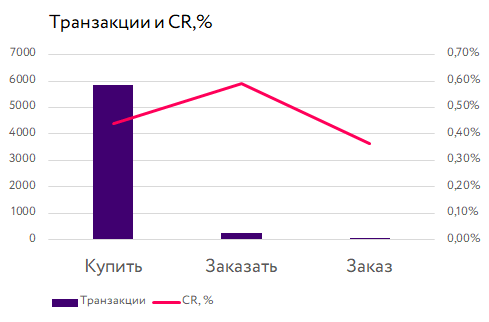 В лидерах по транзакциям «купить», при этом CR выше у «заказать». В данном случае оцениваются схлопнутые транзакционные приставки, включая в себя все вложенные добавки.
