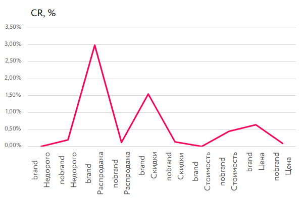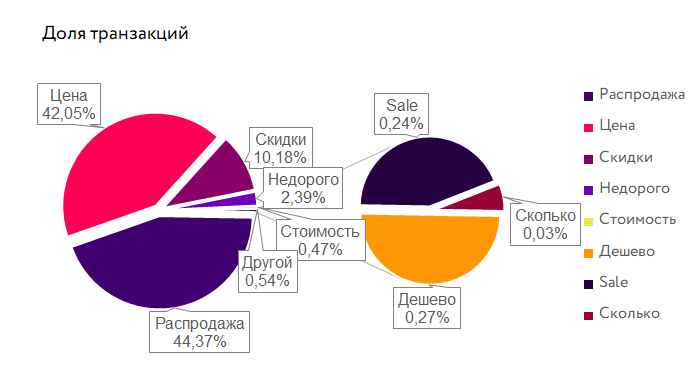 В безоговорочных лидерах: «распродажа» и «цена» — как показало наше исследование, эти слова приносят более 80% конверсий.