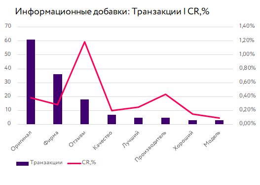 Среди информационных запросов, направленных на поиск дополнительных све́дений о товаре, по коэффициенту конверсии лидируют запросы с добавкой «отзывы».