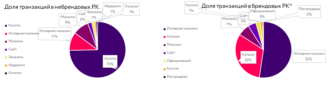 В брендовых РК по числу транзакций лидируют добавки «интернет-магазин» (доля 52%) и «каталог» (доля 32%).