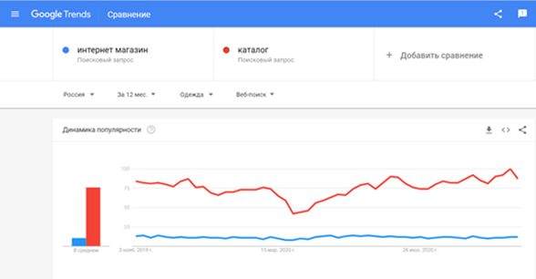 Этот факт подтверждает и статистика Google Trends: «каталог» безоговорочно лидирует по частоте использования в поисковых запросах.
