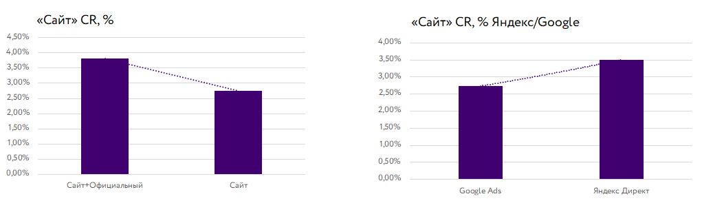 В случае с «интернет-магазином» прослеживается та же тенденция, что и с «сайтом». Добавление приставки «официальный» повышает CR.
