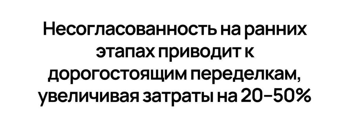 Раздувание бюджета. Несогласованность на ранних этапах приводит к дорогостоящим переделкам, увеличивая затраты на 20–50% — деньги, которые могли пойти на развитие бизнеса.