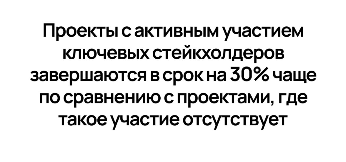 Согласно исследованию McKinsey, проекты с активным участием ключевых стейкхолдеров на начальных этапах завершаются в срок на 30% чаще по сравнению с проектами, где такое участие отсутствует.
