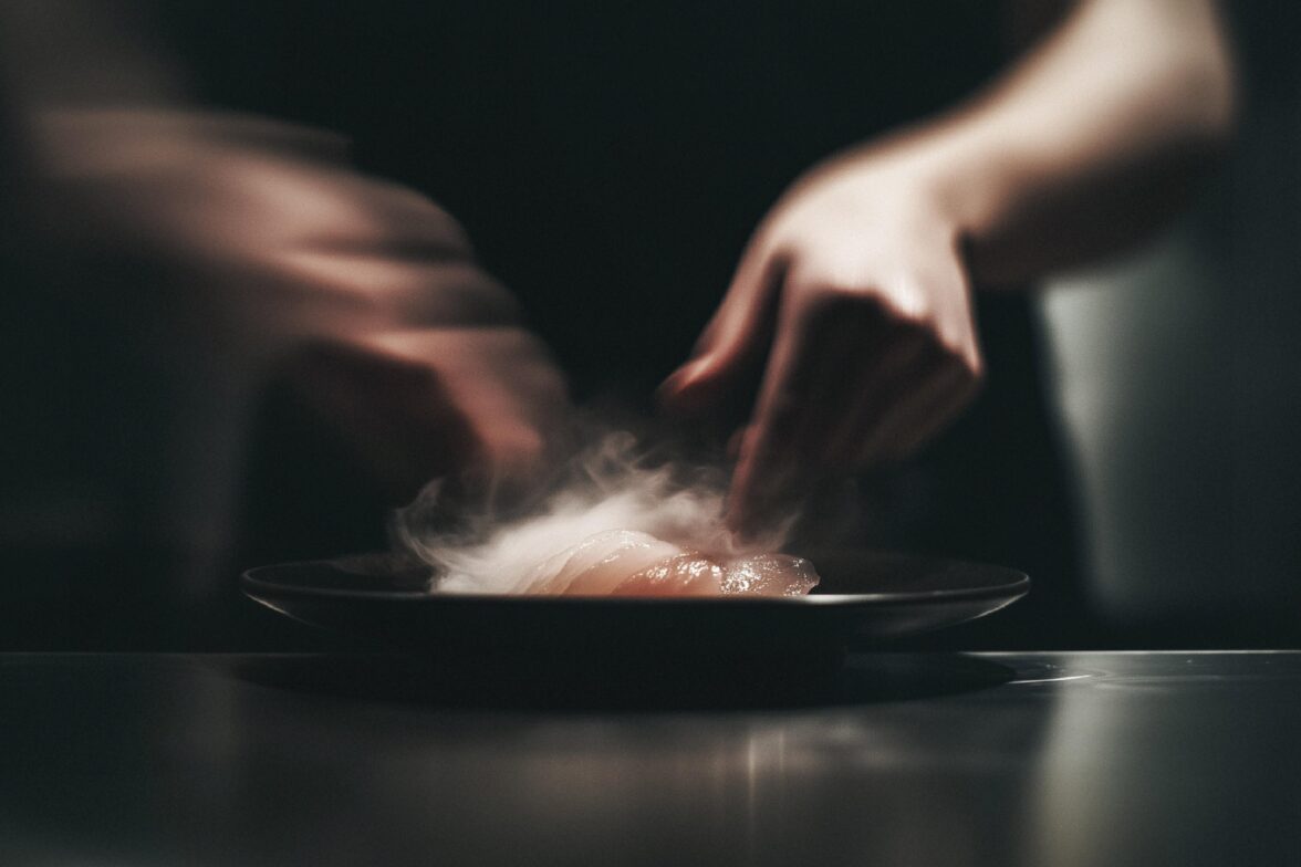 Для визуальных коммуникаций нам важно было уйти от прямой гастрономической подачи — «тарелка на белом фоне» — и найти способ передать атмосферу, эмоцию. Мы разработали собственный фотостиль с помощью генеративных инструментов.