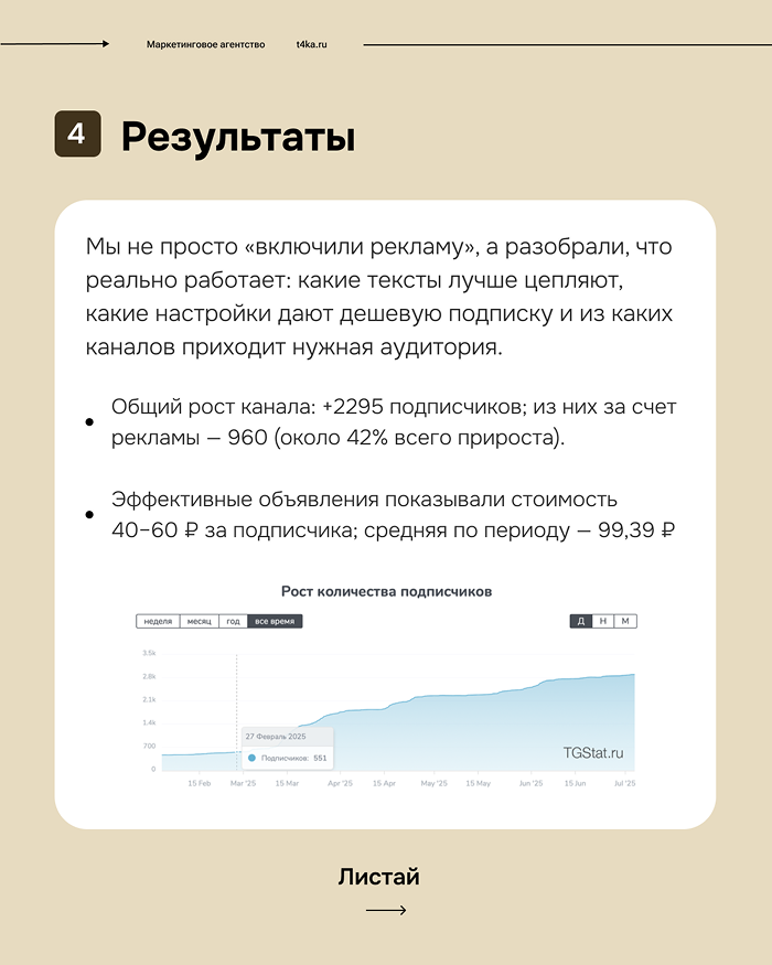 Эффективные объявления показывали стоимость 40–60 ₽ за подписчика; средняя по периоду — 99,39 ₽