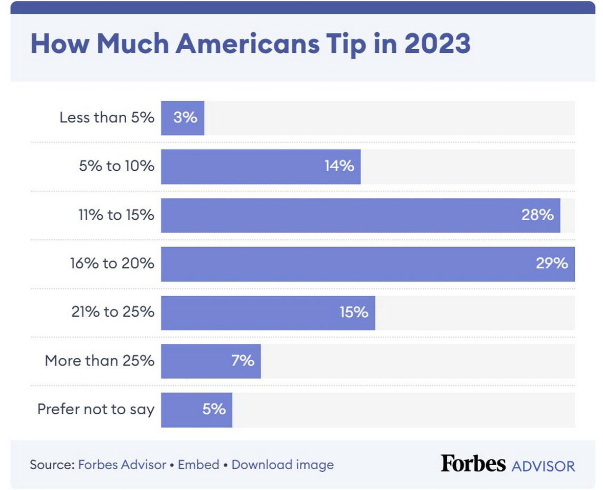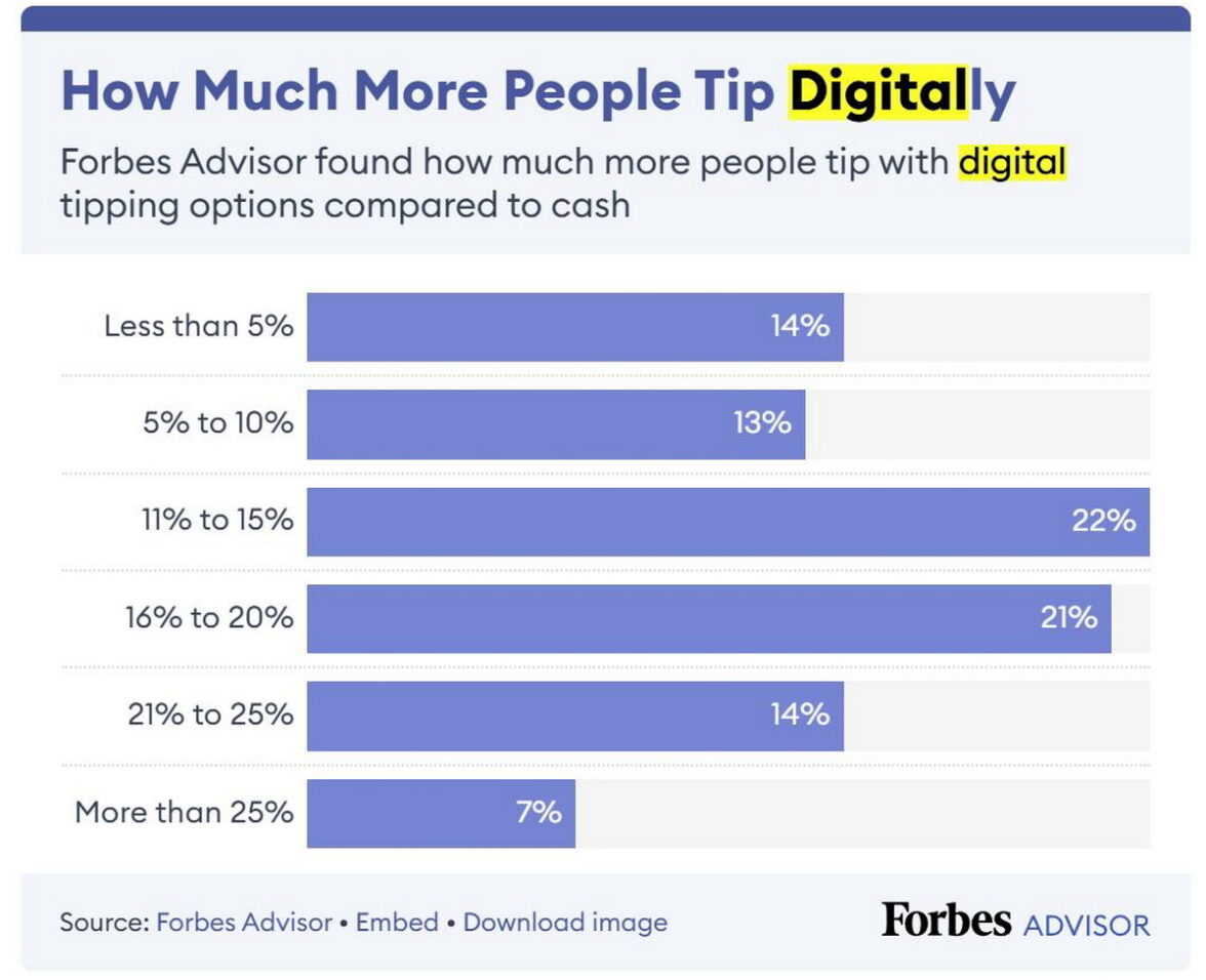 В исследовании Forbes, проведенном в конце 2023 года, говорится, что большинство респондентов (64%) оставляют чаевые на 11% выше, если платят цифровым способом. Аналитики издания связывают это с тем, что покупатели не так чувствуют сумму чаевых, когда выбирают её на экране, чем когда вытаскивают наличные из кошелька. Что касается процентного соотношения суммы счета при оплате чаевых безналичным способом, то 22% респондентов в этом случае оставляют на чай от 11% до 15%, 14% опрошенных — менее 5%, а 7% самых щедрых участников исследования — более 25%.
