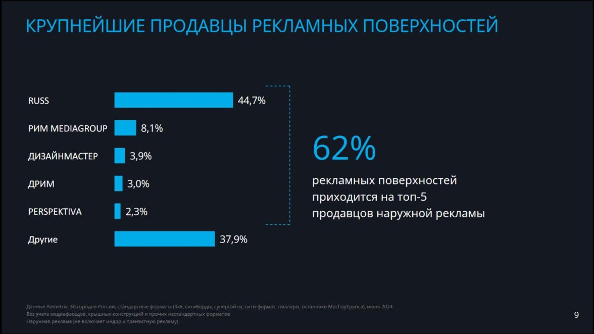 Согласно отчету Admetrix, общее количество рекламных поверхностей в 50 городах России сократилось на 14% с 48 тыс. в июне 2019 года до 42 тыс. в первом летнем месяце 2024-го за счет снижения числа нецифровых конструкций. Однако Admetrix считает одну цифровую поверхность за 10 аналоговых, а с этими вводными количество поверхностей даже выросло на 17% со 137 тыс. в июне 2019 года до 165 тыс. в соответствующем месяце 2024 года.