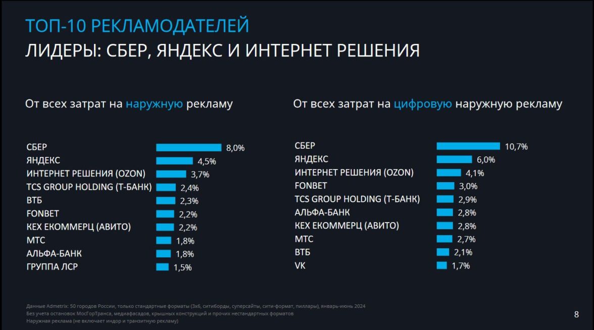Топ-3 рекламодателей в общем рейтинге по наружной рекламе и DOOH-сегменту в первой половине 2024 года также отличаются только процентами, а не позициями: это «Сбер» — 8% в наружной рекламе и 10,7% в цифровой, «Яндекс» — 4,5% и 6% соответственно, и Ozon (3,7% и 4,1%). В топ-5 также входят Т-банк и ВТБ — в целом по рынку наружной рекламы, и Fonbet и Т-банк в DOOH.