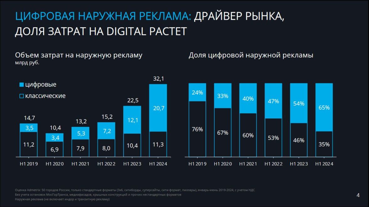 Российская наружная реклама является одним из мировых лидеров по темпам цифровизации и доле цифровых бюджетов (третье место по доле DOOH после Австралии и Великобритании в 2023 году по данным The World Out of Home Organization). По итогам первого полугодия 2024 года сегмент DOOH в России вырос до 20,7 млрд рублей, это на 71% больше, чем в первые шесть месяцев 2023-го, следует из данных индустриального измерителя Admetrix, принадлежащего исследовательской компании Mediascope. Темпы роста DOOH ускорились: они выше прошлогодних в первом полугодии (тогда было 68% год к году) и соответствующего показателя в первом полугодии 2022 года (+36%).