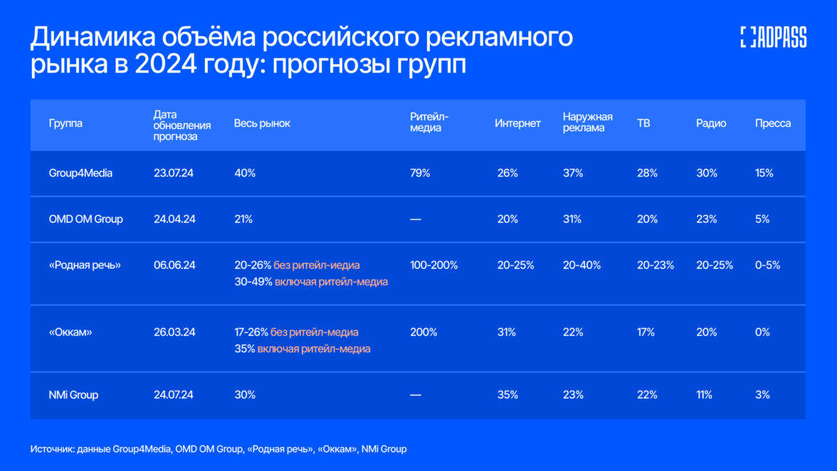 Крупнейшие рекламно-коммуникационные группы России прогнозировали, что рынок наружной рекламы по итогам 2024 года вырастет от 20% до 37%. Самый низкий рост ожидает ГК «Родная речь» — на 20-25%. Самый высокий — Group4Media — 37%.