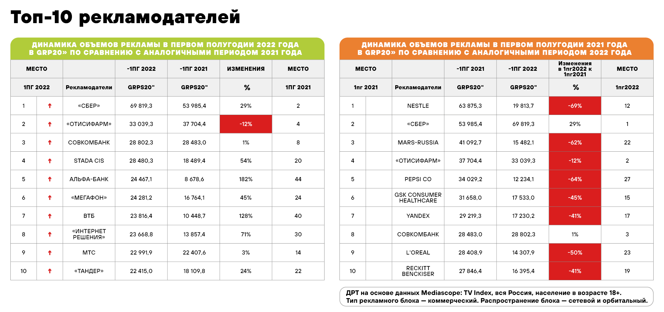 Родионова говорит, что в первом полугодии большинство рекламодателей из первой десятки усилили свое присутствие на федеральном ТВ. При этом состав десятки существенно обновился: в нее вошли сразу семь новых компаний. Стремительный рост продемонстрировал банковский сектор. Так, пятое место занял Альфа-банк, который в первом полугодии 2021 года находился лишь на 44 строке. Банк ВТБ поднялся с 40 на седьмую позицию. При этом Альфа-банк увеличил объемы размещения на 182% в GRP, а ВТБ — на 128%. Фармкомпания Stada CIS, сотовый оператор «Мегафон», маркетплейс «Интернет решения» (Ozon) и розничная сеть «Тандер» («Магнит»), год назад занимавшие места в тридцатке, теперь расположились на четвертой, шестой, восьмой и десятой позициях.