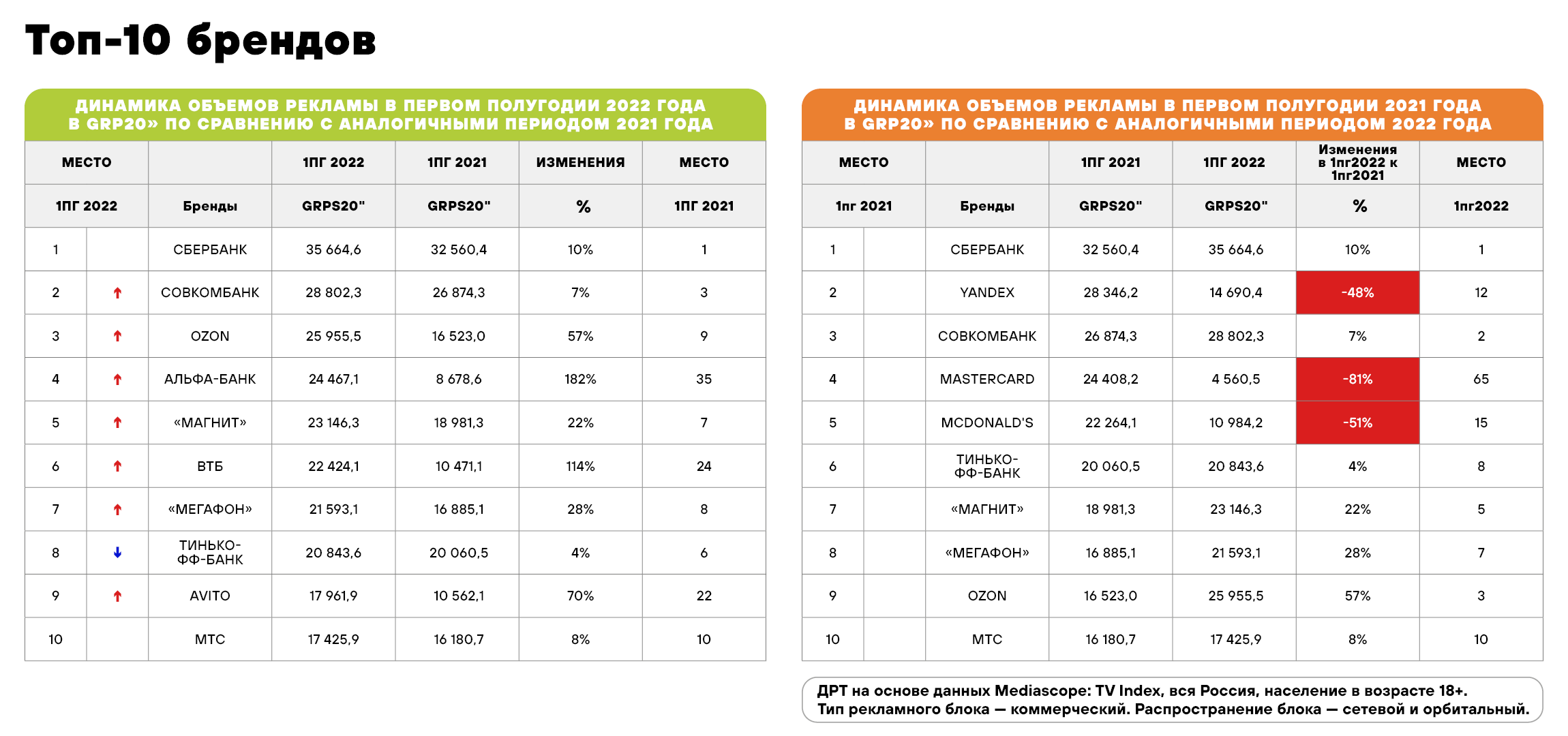 Первая десятка брендов изменилась не так существенно, как это произошло с крупнейшими рекламодателями. Новичков в списке лидеров по размещению на ТВ всего трое: Альфа-банк, у которого количество GRP выросло на 182% (поднялся с 35 на четвертое место), ВТБ с ростом на 114% (поднялся с 24 на шестое место) и сервис интернет-объявлений «Авито», увеличивший количество телерекламы на 70% (поднялся с 22 на девятое место). Остальные бренды, вошедшие в десятку, нарастили объем телерекламы от 4% до 70%.