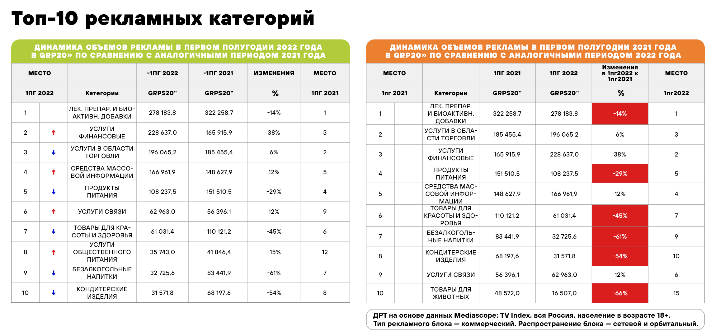 В десятке ведущих рекламных категорий в первом полугодии 2022-го существенных перестановок не было. Единственное значимое изменение — реклама услуг общественного питания. Год назад она занимала 12 строку, а теперь переместилась на восьмую позицию, вытеснив из десятки категорию «товары для животных», объем рекламы в которой сократился на 66%.