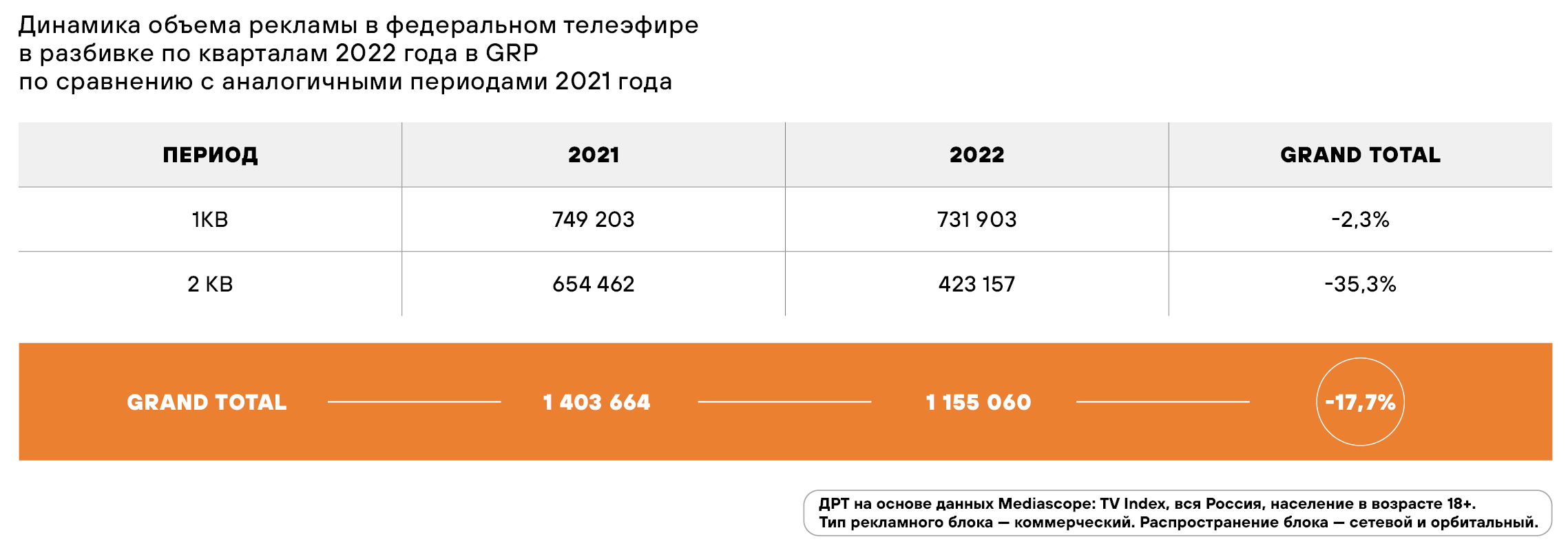 В пунктах рейтинга падение было менее значительным. По итогам первого полугодия 2022 года объем сократился на 17,7%, с 1,4 млн до 1,2 млн GRP (Gross rating point`20, накопленный рейтинг — условная единица, отражающая число зрителей, увидевших стандартный 20-секундный ролик в национальном эфире в аудитории старше 18 лет). В первом квартале медиааудитор зафиксировал снижение на 2,3%, во втором — 35,3%.